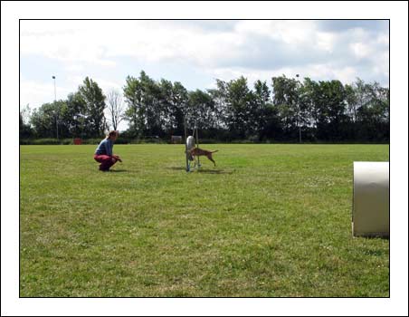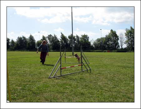 Agility nybörjarkurs sommaren-06 1:a tillfället: Vi började första tillfället med att köra hopp, slalom och tunnel. Ingetdera var något som helst problem för Biggles. Han är orädd och glad! Dessutom är han mer uppmärksam på mig än väntat, och mindre intresserad av de andra hundarna än väntat. Skönt! Slalom var svårast, speciellt för mig! När jag får in tekniken klarar även Biggles det galant! 2:a tillfället: Andra gången jobbade jag och Hannah ställde upp och tog med Biggles till kursen. Nya hinder för dagen var A-hindret och däcket, vilket inte var några problem. A-hindret tycker Biggles är riktigt roligt, men han har lite svårt att sakta in mot slutet. Inte heller denna gång var det problem med de andra hundarna, trots att en stor hund sprang fram till honom vid ett par tillfällen. Alla tyckte han gick jättebra, vilket givetvis även var Hannahs förtjänst! 3:e tillfället: Missade vi tyvärr. Tränade dock hindrena på egen hand, Balansen (som var lite läskig i början men som gick bra efter ett tag) och säcken (inga problem). 4:e tillfället: Gick igenom Gungan, långhopp och oxer. Gungan tog vi sakta men säkert och han verkar inte rädd för den, utan ska bara vänja sig vid att den vippar ner. De andra, inga problem. Vi körde även en liten bana med balans, tunnel, A:et och två hopp. Där stötte vi på vår största svårighet hitills, att ha Biggles på min högra sida. Eftersom han tränat en del lydnad och även är van att alltid gå på vänster sida om barnvagnen, blir han helt förvirrad när jag är på "fel" sida om honom. Detta ska vi träna massor på under semesteruppehållet som är på två veckor.