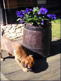 När vi fikade fick Biggles vara i kompostburen en stund. Isak