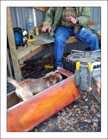 Grytträning Första gången man tränar gryt ska hunden i princip bara få bekanta sig med grävlingen. Vi satte ner Biggles i en av gångarna, som var öppen, en liten bit ifrån grävlingen. Till en början var han tveksam, men efter ett tag började han smyga sig framåt och morrade åt grävlingen. Vi hetsade på honom och berömde (allt efter instruktioner från tränaren) när han gick närmare och efter ett tag gick han igång och tokskällde. Han var heltänd och tuggade fradga, men lugnade sig genast när Pär sen lyfte upp honom och berömde. Efter en stunds vila fick han testa en gång till, och fick då även krypa igenom en stängd gång för att komma fram till grävlingen. Till våren, när träningen startar igen hoppas vi kunna åka upp och träna mera med Biggles. Det är roligt att testa olika aktiviteter, och speciellt sådana som borderterriers är ämnade för.
