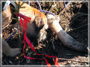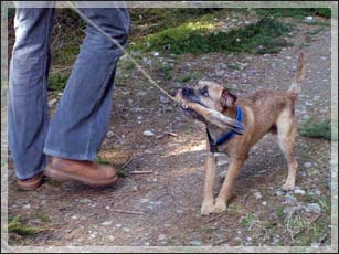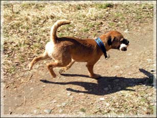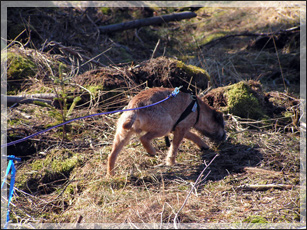 28/3: Vid andra kurstillfället fick Biggles gå ett spår på ca 400 meter, med en vinkel, även denna gång på kalhygget. Fram till vinkeln (ungefär halvvägs) tuffade han på utan att tveka, men vid och efter vinkeln var han lite tveksam och ringade för att hitta spåret. Med lite stöd från Pär klarade han sig dock fram till skanken utan större problem. Det märktes att han blev trött mot slutet och fick kämpa för att koncentrera sig. Det var ganska blåsigt nere på kalhygget, vilket försvårade spårandet lite. En nöjd Biggles studsade sedan tillbaka med skanken i munnen.
