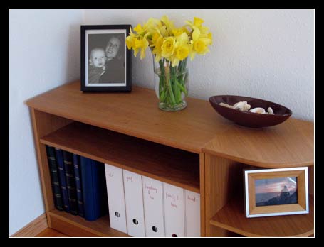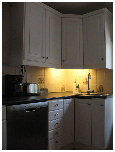 Under påskhelgen genomförde vi även budgetrenoveringen av vårt kök. Pär fick låna plats i Jens & Mimmis källare för att spraymåla de gulfula luckorna vita. Vi satte även in ny bänkskiva. |